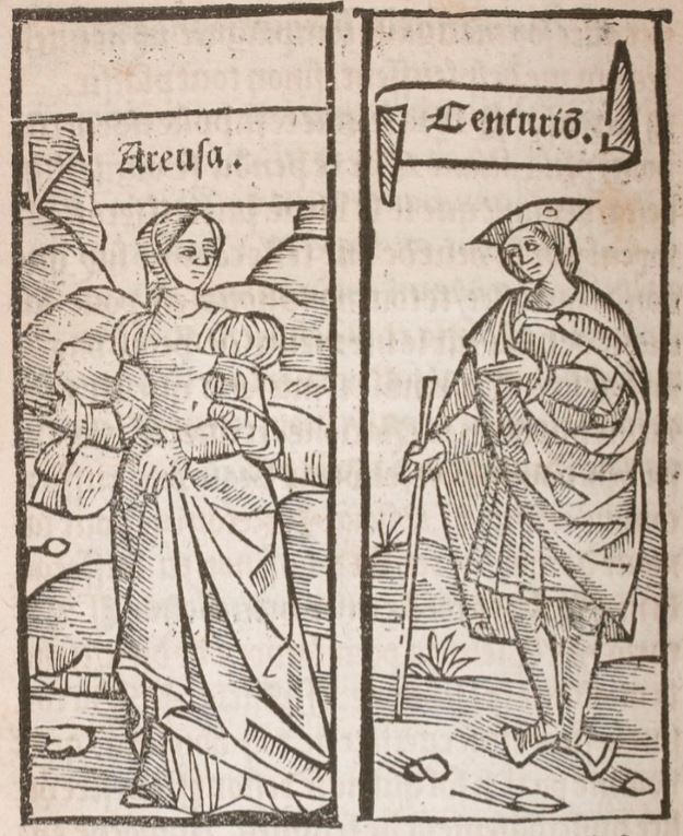 The left panel depicts Celestina’s prostitute Areusa, who is wearing a veil and a robe. To the right, we see Centurio wearing a hat and holding a long item of some sort, perhaps a cane/walking stick. Both figures are placed outside.The left panel is identical to those found on pages 173, 287, and 306, and is nearly identical to those found on pages 12, 208 and 271 (where it is labeled ‘Melibea’), page 84 (labeled ‘Lucrecia’), and page 350 (labeled ‘Alisa’). The right panel is nearly identical to those found on pages 12, 60, 122, 225, and 235 (where it is labeled ‘Calisto’).
