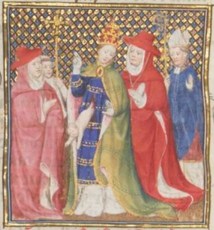 A maiden named Joan had disguised herself as a man in order to follow her lover to England while he attended school. Joan had excelled in academics and became incredibly knowledgeable while attending school. Continuing to dress as a man, Joan went to Rome and was elected to succeed as Pope, known as Pope John. No one had known she was a woman, however, she ended up having a love affair which resulted in pregnancy. This illumination depicts Joan, dressed as Pope John, standing in the centre of the image as she gives birth to a child. The child is depicted coming out from her stomach. The birth happened during a public procession which revealed her identity as a woman. There are people surrounding Joan who look shocked at what they are witnessing. According to Boccaccio, Pope John (Joan), was thrown into a dungeon to die as punishment for posing as a male while holding the title of Pope.