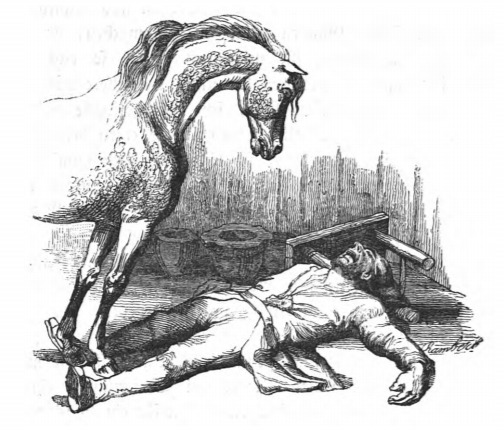 Here we see Gulliver who has passed out at the feet of his master after hearing that he must leave the Country of the Houyhnhnms. The Council of the Houyhnhnms told his master that Gulliver either had to live with the yahoos or return to Europe but could not live with the Houyhnhnms any longer. Gulliver was shocked by this, and decided he had to leave rather than live with the yahoos. The same image appears in the 1839 Krabbe edition.