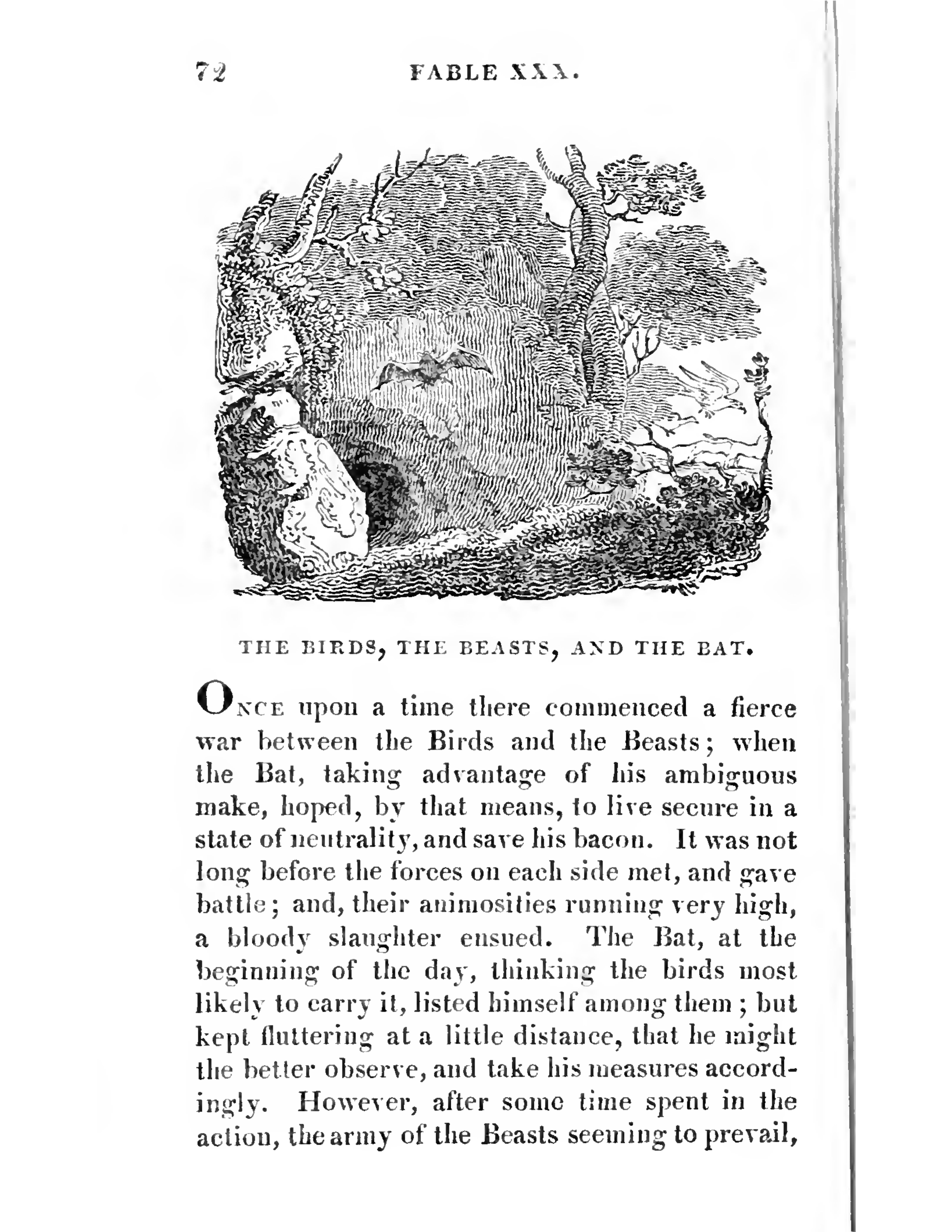 There is a small cave-like hole in a large rock in the bottom left of the image. A large rock in the foreground blocks the view of half of the hole that lies behind it in the middle ground. A bat in the air is above and slightly to the right of the hole. To the right in the background is two white birds flying above two animals on the ground. The rest of the background is covered in trees.