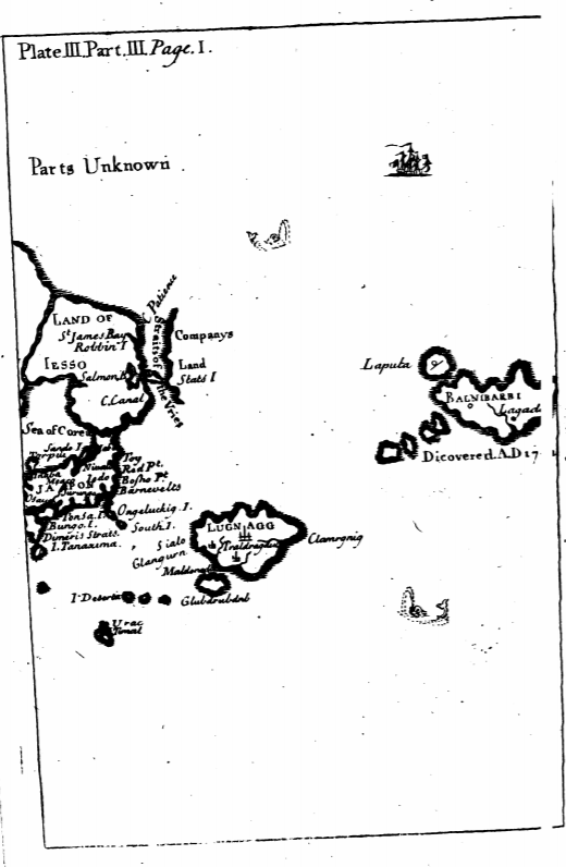 Here we see a map of the various countries Gulliver visited in the third part of the book. These include Laputa, Balnibarbi, Luggnagg, Glubbdubdrib, and Japan, among others. Underneath Balnibarbi we see “Discovered AD 17...” with the rest of the date obscured. We also see several ships drawn on the water.