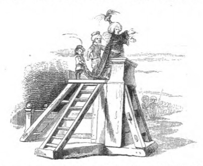 Here we see the Emperor of Lilliput addressing Gulliver. The Emperor stands on a podium with his arms outstretched towards Gulliver. A page holds the Emperor’s robe, and the Emperor wears a turban with a large feather. Other officials surround the Emperor. The same image appears in both the 1839 and 1843 Krabbe editions.