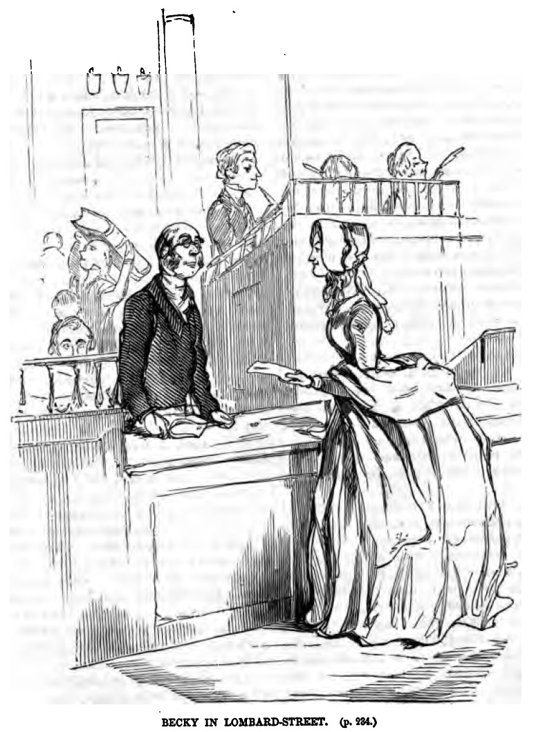 Rebecca Crawley stands at the desk of Messrs. Jones and Robinson’s bank. She is holding out a document which Lord Steyne sent to her, entitling her to a large sum of money from his account. On the other side of the desk is a bank official, holding a coin shovel. In the background are other employees of the bank, both seated and standing, holding quills and books. Below the illustration is printed its title and location in the story, “BECKY IN LOMBARD-STREET. (p. 234.)”.