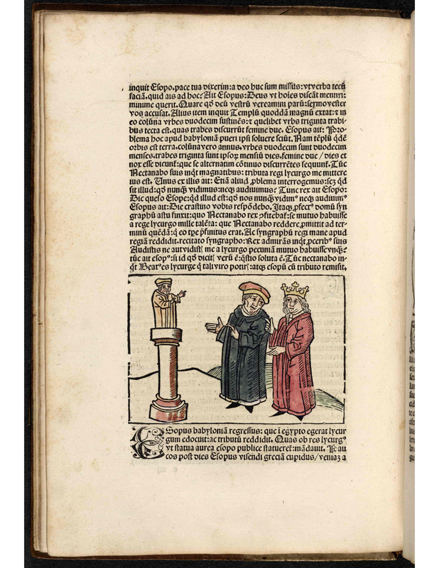 Esopi Appologi siue Mythologi cum quibusdam carminum et fabularum additionibus Sebastiani Brant. [Two men looking at statue on podium]