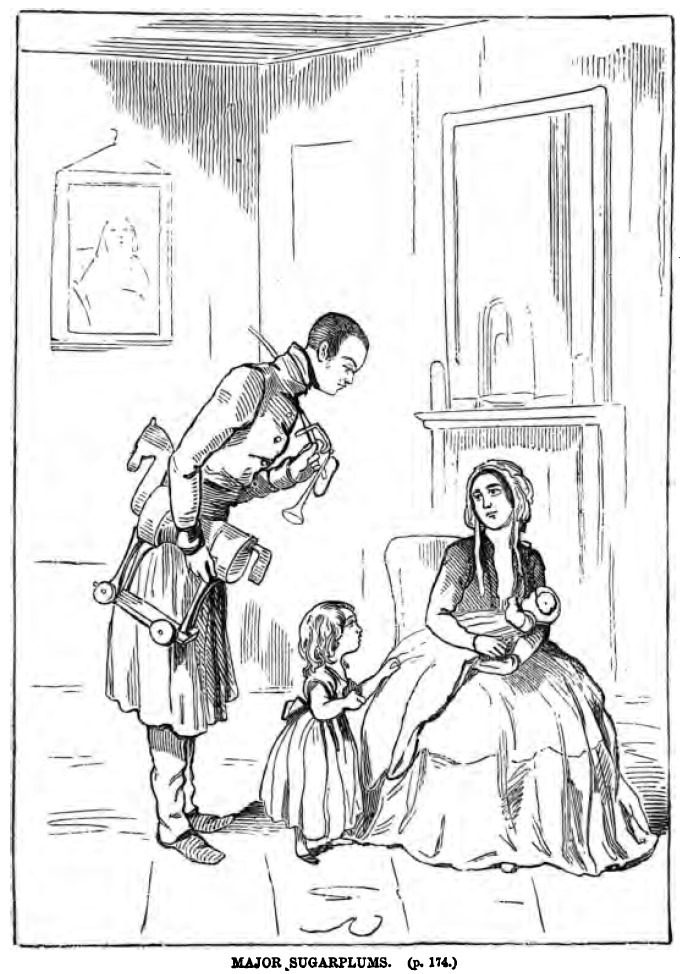 William Dobbin, carrying a toy sword, trumpet, and wooden horse on wheels, bows to Amelia Osborne. She is seated on a chair, holding her son Georgy, who is asleep. At her side is Mary Clapp, the landlord’s daughter, acting as the mistress of ceremonies to announce Dobbin, whom she calls Major Sugarplums. Below the illustration is printed its title and location in the story, “MAJOR SUGARPLUMS. (p. 174.)”.