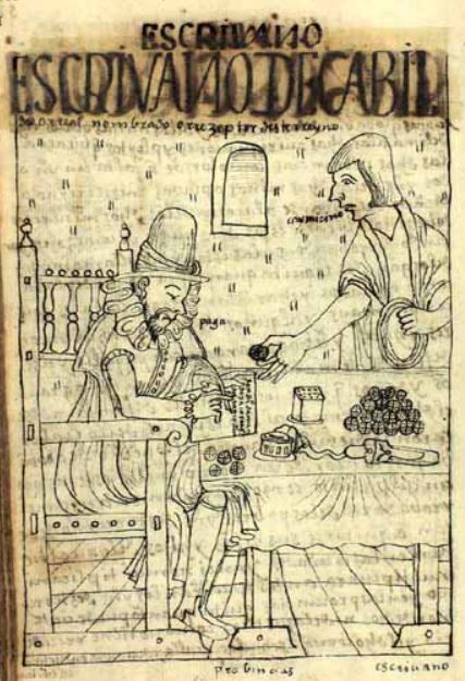 This image is illustrated in a chapter that discusses and criticizes the government and society in Spanish conquered Peru. This image depicts a Spanish notary sitting at a table on the left side of the image writing on a piece of paper. The piece of paper reads, “don diego de mendoza, corregidor desta prouin” [Don Diego de Mendoza, magistrate of this province]. The author criticizes these government officials as they would take financial advantage of the indigenous peoples by taking more tribute from them than required. There is an indigenous man on the right side of the image handing money to the notary. There is dialogue written by their mouths. The notary says, “paga” [pay me]. The indigenous man says, “caymi, cino” [here you have it, sir].