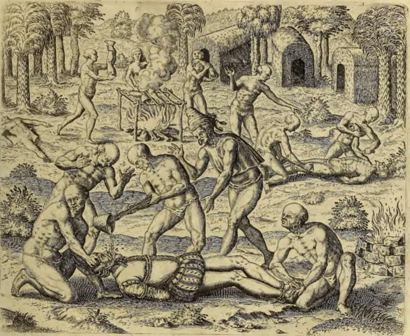 A Spanish man lies on his back on the ground, bound by ropes and restrained by Indigenous men who hold his head and feet. Another Indigenous man pours melted gold into the Spaniard’s mouth, while two other Indigenous men watch. To the right, two Indigenous men dismember the body of a second Spaniard. In the background, another body lies on the ground, this one missing a leg. Nearby, several Indigenous people stand around a fire with a wooden frame set over it for roasting limbs, and one of the men begins to eat a dismembered arm. There are several dwellings in the background.