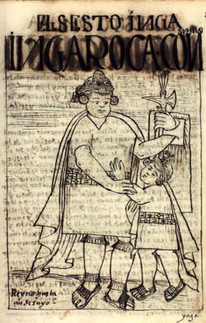 This illustration depicts the sixth king of the Inca Empire, Inca Roca. He is pictured looking down at his son and holding him with his right hand and holding a shield and ax in his left hand. The author describes him as a wide and long man. His son’s name is Guaman Capac Inca. There are words written at the bottom of the image which reads, “Reynó hasta Ande Suyo” which translates to “King up to the Andes region.”