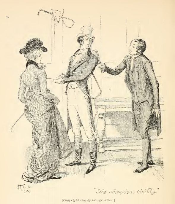 In this image Mr. Collins congratulates Elizabeth and Mr. Darcy on their engagement. Mr. and Mrs. Collins came to Longbourn to express their congratulations to the couple, and also to avoid Lady Catherine de Bourgh who was furious at the match because she wanted Mr. Darcy to marry her daughter. Although neither Elizabeth nor Mr. Darcy liked Mr. Collins, Elizabeth was pleased that he tolerated Mr. Collins’ foolishness well. In this image Elizabeth and Darcy prepare to go horseback riding, and Mr. Collins brushes Mr. Darcy’s shoulders. This scene occurs in chapter 60. The characters are shown in the traditional regency style. Elizabeth wears a regency dress with an empire waist. She wears a bonnet and holds a whip. Mr. Darcy and Mr. Collins wear waistcoats and tailcoats. Mr. Darcy wears a top hat and carries a whip. The regency period dated to the early nineteenth century (1811-1820) when George, Prince of Wales, later George IV (r. 1820-1830), reigned as regent for his mentally ill father, King George III (r. 1760-1820). The regency period is associated with the rise of neoclassicism in art and fashion.