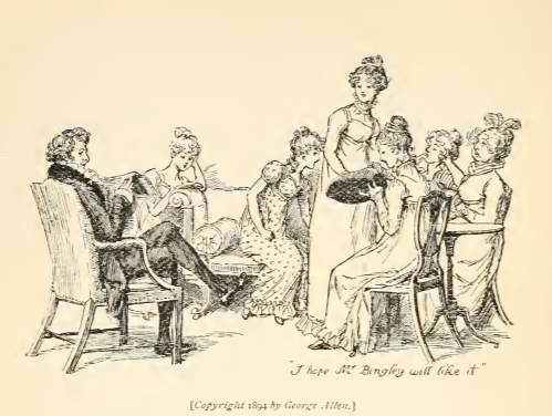 In this image Mr. Bennet sits with his five daughters and wife. Mr. Bennet was one of the first people to call on Mr. Bingley after his arrival at Netherfield Park. Jane holds her hat that she was trimming and remarks that she hopes that Mr. Bingley will like it, thinking the whole family would go with Mr. Bennet to visit Mr. Bingley. Mr. Bennet responds that he will go alone, disappointing his wife and daughters. This scene occurs in chapter 2. The characters are shown in the traditional regency style. Mr. Bennet wears a waistcoat and tailcoat and a cravat. Mrs. Bennet and her daughters wear regency style dresses with empire waistlines. Mrs. Bennet has a feather in her hair. The regency period dated to the early nineteenth century (1811-1820) when George, Prince of Wales, later George IV (r. 1820-1830), reigned as regent for his mentally ill father, King George III (r. 1760-1820). The regency period is associated with the rise of neoclassicism in art and fashion.
