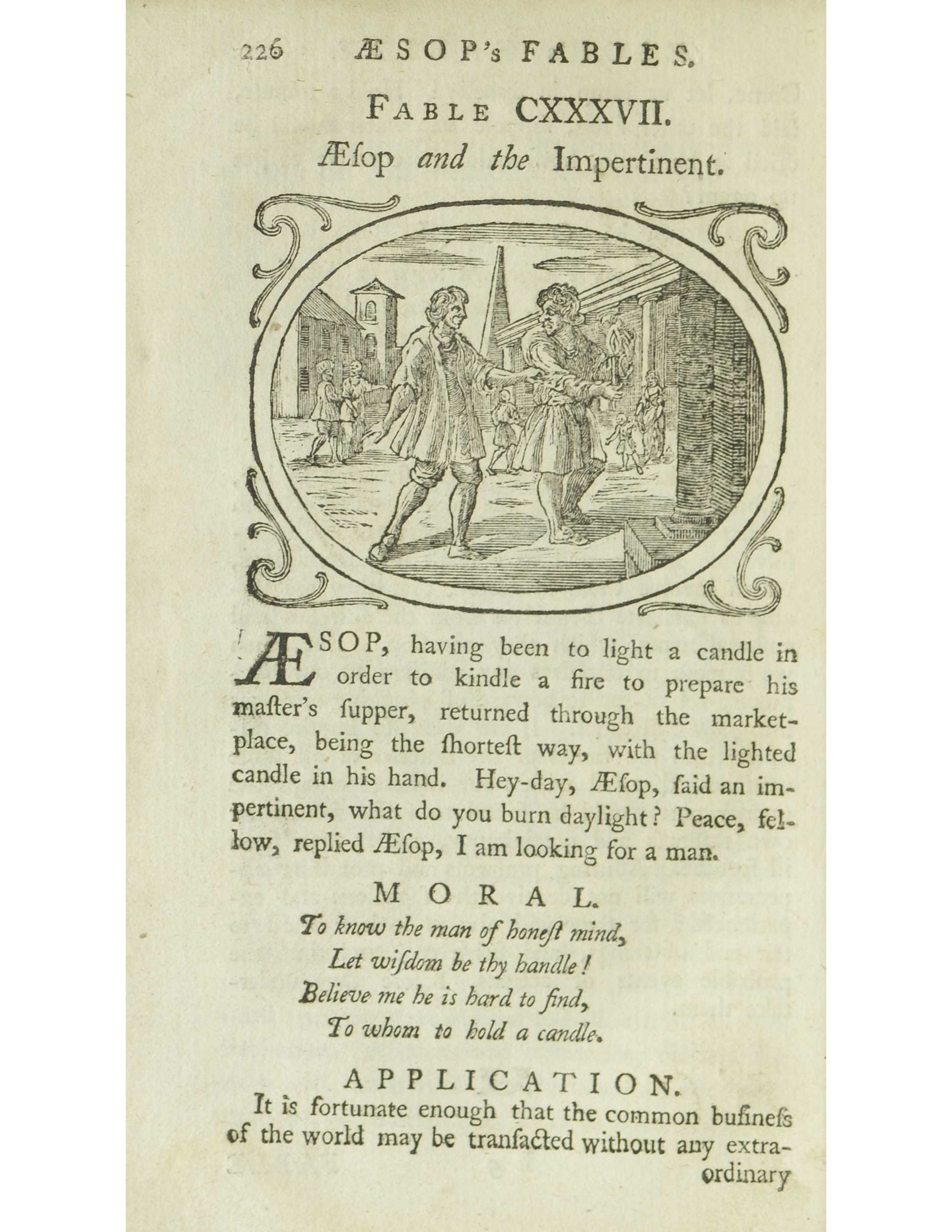 The scene is taken place outside, there is multiple people and children in the background walking through the market-place with multiple buildings surrounding them. Aesop is holding a lit candle to kindle a fire to prepare his master's supper, while an impertinent grabs Aesop by his sleeve and asks 'what do you burn daylight?'.