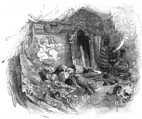 Here we see a Lilliputian dining table. There are various fruits and vegetables on the table, and a painting of two cherubs on the wall, next to a mirror. Steam emerges from one of the bottles along the right hand side. We also see a face in the bottom right corner. This image appears in the appendix to Gulliver’s travels in Lilliput. The same image appears in the 1843 Krabbe edition.