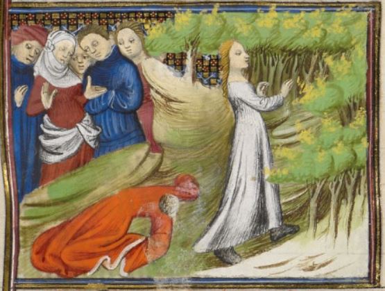 This illumination depicts a woman named Sulpicia leaving her home to find her exiled husband. Her husband, Lentulus Cruscellio, had evaded proscription and fled to Sicily to live in exile. Sulpicia was incredibly devoted to her husband and left the comfort of home to follow him into exile. There are people on the left side of the image watching Sulpicia leave. Sulpicia is depicted throwing away a red robe as she leaves behind her life to go with her husband.