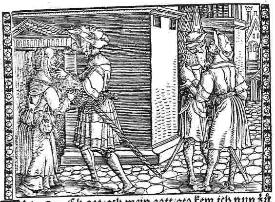 While walking home, Celestina (leftmost figure) sees Sempronio (right-central figure) and Pármeno (rightmost figure), who are going to check on Calisto (left-central figure) at Saint Mary Magdalene’s church. The two servants enter first, and Celestina follows closely behind. She tells Calisto that she has good news, and the four of them go to Calisto’s house for privacy. Once there, Celestina tells him that Melibea is passionately in love with him and has agreed to meet at midnight. Calisto is overjoyed, but Sempronio and Pármeno express suspicion at Melibea’s sudden change of heart.