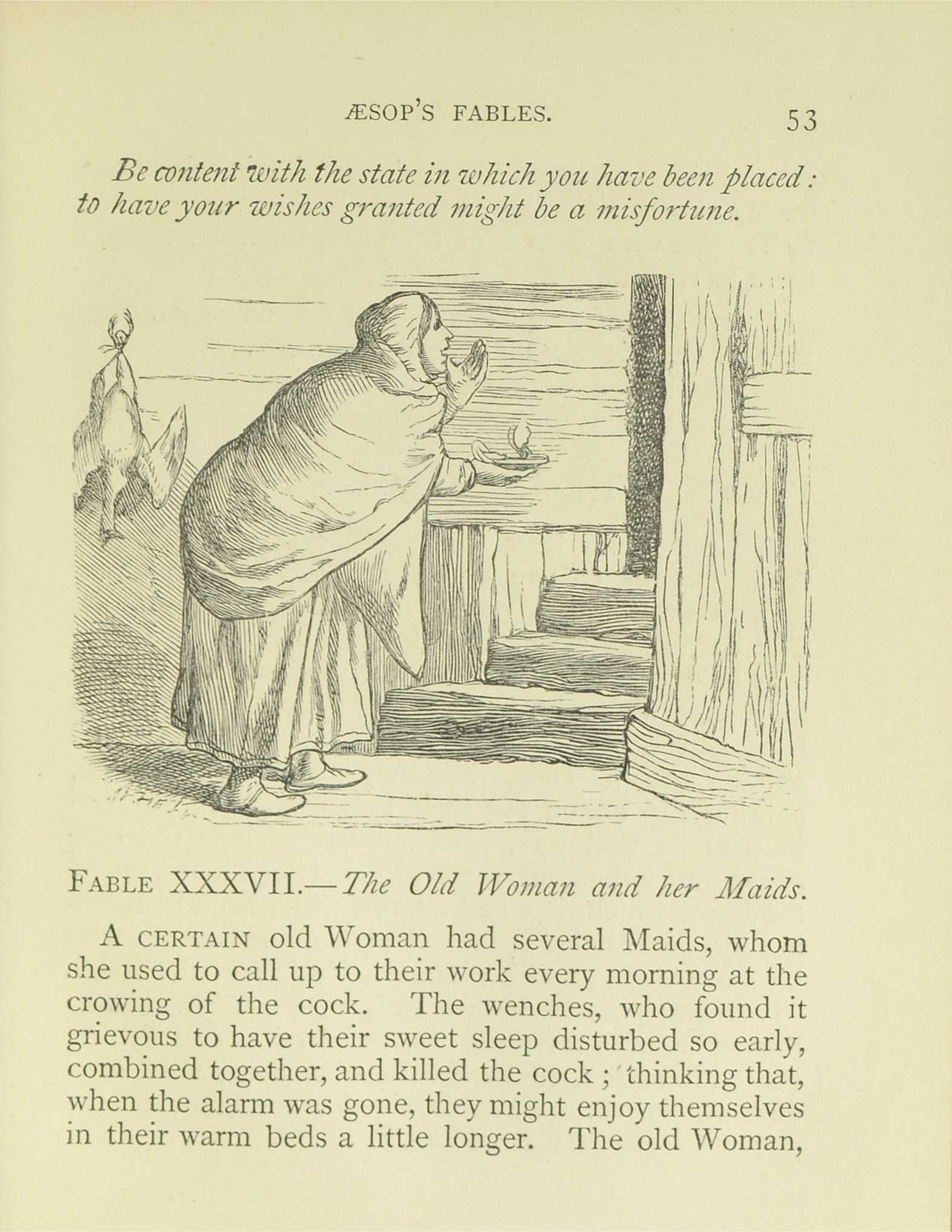 An old, hunched woman with a lit candle in her right hand appears to be calling to someone at the top of the stairs on the right as she has her left hand beside her mouth. Farthest to the right there is a large wooden wall that continues to the wooden staircase the woman stands at the base of. To the left of the woman, on the wall there is a bird hanging upside down with its feet tied together and is presumably dead.