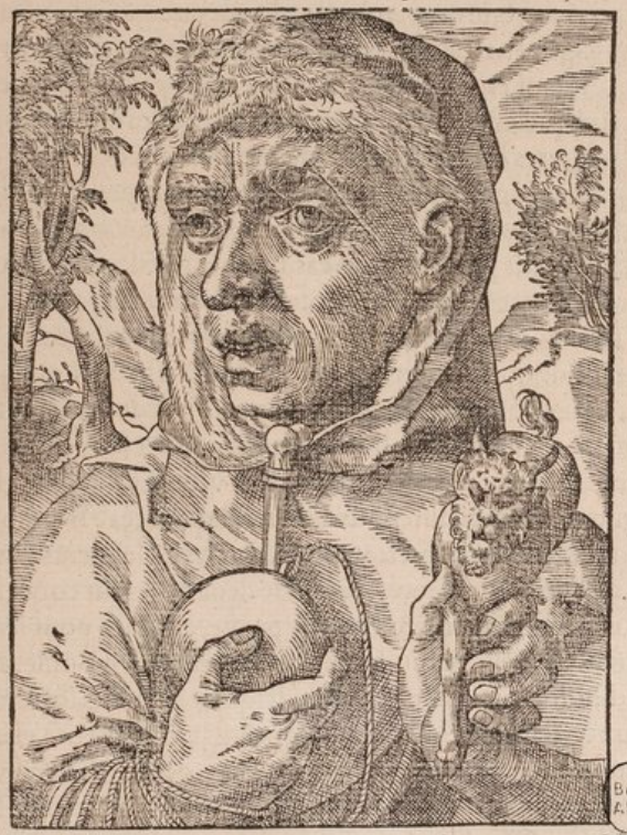 An Indigenous South American man of large stature holds an animal in one hand and an object in the other. He wears a long-sleeved garment with a hood. This image comes from a chapter entitled ‘D’une Isle, où les hommes sont grands de dix à douze pieds', (Of an island, where the men are tall at 10 to 12 feet), referring to an island in the region of Patagonia, South America. A Spanish expedition in 1520 led by Ferdinand Magellan explored the South American coast of Patagonia (today Argentina and Chile) and encountered a group of Indigenous people, likely the Teheulche. The Spaniards described the Teheulche as giants, but later travelers disputed this description, saying the Teheulche were of average build. This image is identical to one found on page 905 of Paris 1575 (l’Huillier).