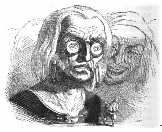 In this image we see two giants looking at Gulliver. The giant in the front wears circular glasses with shoulder length hair and a beard. He also has hoop earrings with beads on the bottom. The second giant stands behind the left shoulder of the first. He wears a cap and has a large grin. Gulliver stands on the table at shoulder height, leaning back from the giants. The same image appears in the 1839 Krabbe edition.
