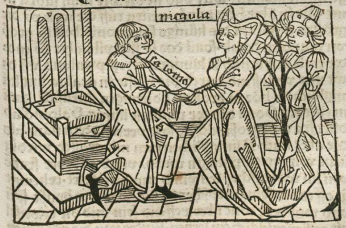 This engraving depicts Nicaula, the queen of Ethiopia, on the right side of the engraving shaking hands with king Solomon of Jerusalem. We know that these figures are Nicaula and Solomon as their names are engraved beside their heads. Nicaula, as Boccaccio explains, was incredibly wise and wanted to hear and listen to the wisdom and intellect of Solomon. She had traveled from Ethiopia to Jerusalem to meet him. This engraving depicts their first meeting. Behind Nicaula is presumably one of her servants, who is carrying a balsam tree. The tree was one of many gifts that Nicaula had given to Solomon.