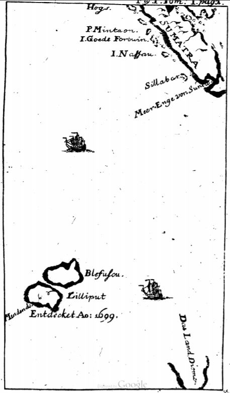 A map of depicting the fictional lands of Lilliput and Blefuscu that Gulliver visited in the first part of the story. Under the fictional lands is written “Entdecket Ao: 1699”, meaning “discovered in 1699”. The map also depicts the lands of “Diemen” and “Sumatra”. Two ships – likely the “man-of-war type ships which were popular in the eighteenth century and are mentioned in the text – are shown. The map in this edition is the same as that in the 1727 German von Wiering edition.