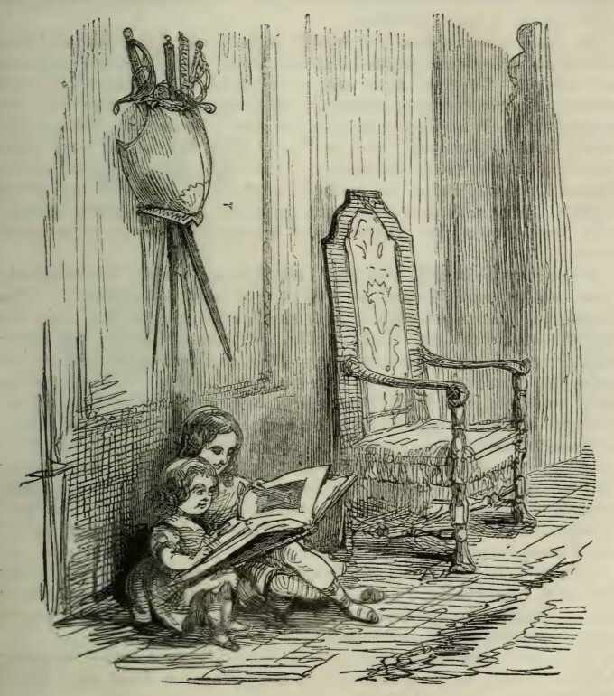 - Lord Gaunt’s children sit on the floor underneath a decorative set of swords, reading a book together. Next to them is an empty chair.
