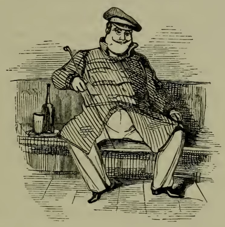 Joseph Sedley sits on the roof of the cabin on the boat from England to Belgium. Beside him on the bench are a cup and bottle of beer. He is dressed in his military coat, holding a long pipe, and looks very comfortable and relaxed.