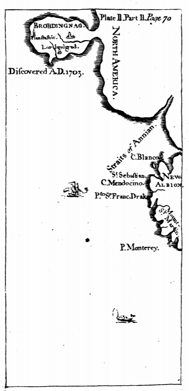 The image depicts the fictional land of Brobdingnag, off of North America. The cities of Flagnlamic and Lorbrulgrud are shown in Brobdingnag. Underneath Brobdingnag reads “Discovered AD. 1703”. The bottom half of the map includes New Albion. A ‘man-of-war ship is shown off the coast of New England, and a dolphin is near the bottom of the image. The same map is featured in several other editions of the text, including those in other languages.