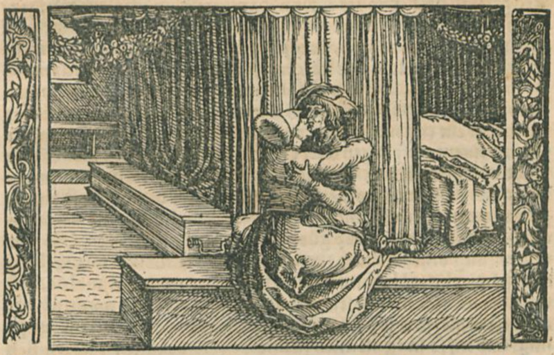 This illustration is interesting, seeing as no characters embrace during the seventeenth act. Areusa does manipulate Sosia into revealing when and where Calisto meets with Melibea, but Sosia does not describe in any detail the nature of their encounters.