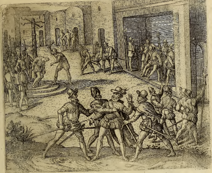 This storied image shows the imprisonment and execution of Diego de Almagro in Cuzco, at the hands of Spaniards loyal to Francisco Pizarro. In the foreground, Diego de Almagro is seized by three Spanish soldiers. He is escorted towards a building used as a prison on the right. Inside the prison, de Almagro is strangled using a rope tied to a wooden pole while three Spanish soldiers watch. His body is then carried to the left into the public square, where he is tied to a post and beheaded with a hatchet in front of an audience. Three Inca men watch the proceedings from the background.