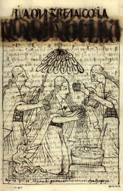This image depicts Rawa Ocllo, the eleventh Coya [Queen] of the Inca Empire. She was married to her brother, Huayna Capac, the eleventh Inca king. The author describes her to be an incredibly beautiful woman who was charitable towards the poor and sick. She is illustrated kneeling in the centre of the image as her hair is being combed and washed by two female servants. The servant on the left side of the image is also depicted holding a fan of leaves over her head for shade. The words “Reyno Quito, Cayanbi, Guanca Bilca, Canari, Chachapoya” are written at the bottom of the image which describes the cities that this king and queen reigned over.