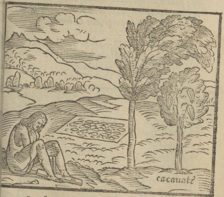 An Indigenous person sitting on the ground is in the process of starting a fire by twirling a smaller stick against a log. Nearby there are two trees, the smaller one labelled ‘cacauate’ (a cacao tree) has several large seeds amongst its branches. In the background, a number of the seeds have been picked and laid out to dry on a blanket on the ground. This image is identical to one found on page 102 of Venice, 1565.