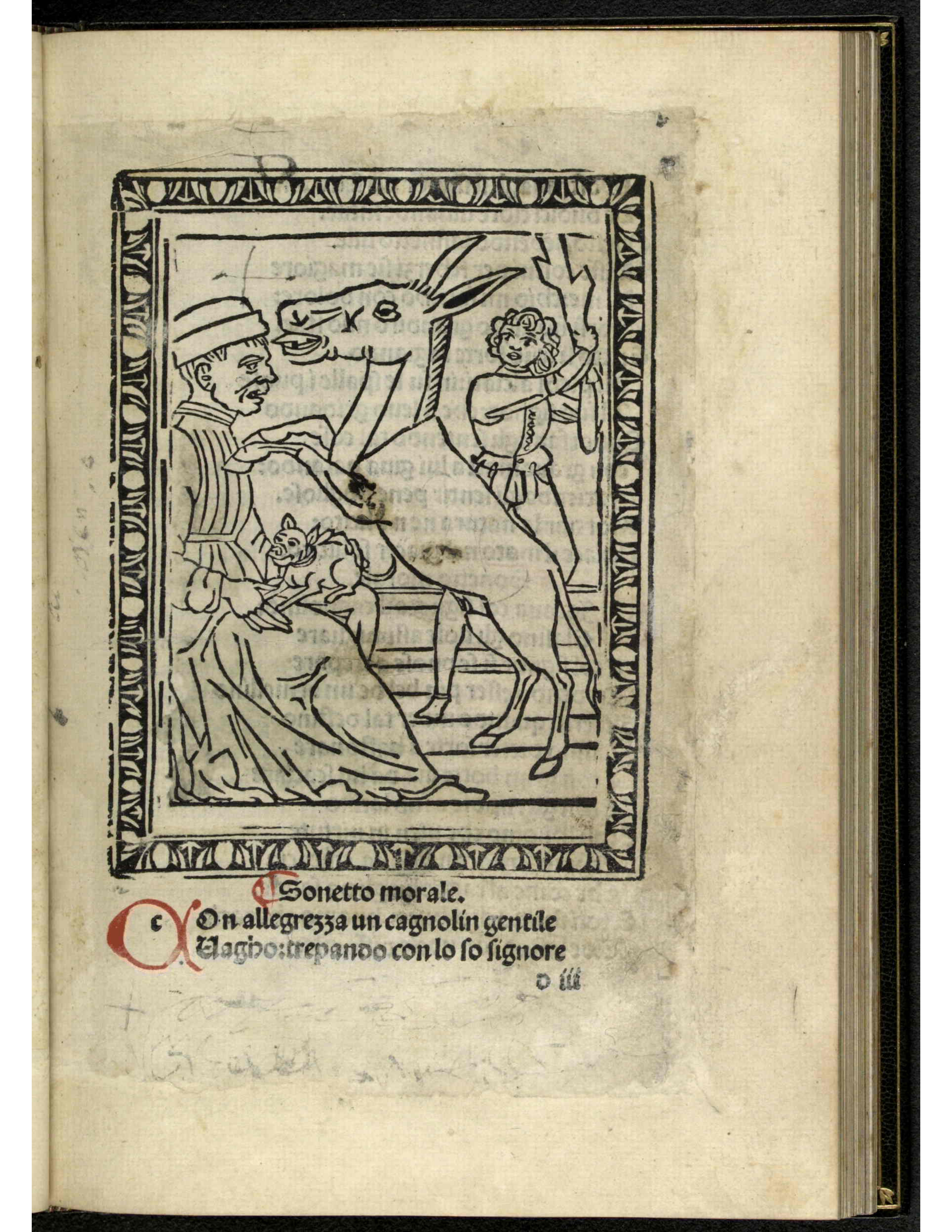 On the left side is a man sitting. He wears a long tunic and a short bucket-hat. The man is holding a creature and is petting it with his left hand. The creature has ears, four legs, and a tail, possibly a small puppy. Next to the man is a donkey on its hind legs, and another person is behind that donkey, raising a long piece of wood in the air ready to whack it.