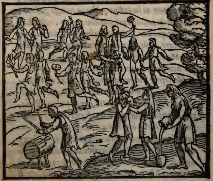 A group of Indigenous people engage in festivities with drinking, dancing and music. One person in the front right pours a beverage from one pot into another, while two people nearby drink. An individual on the left plays a barrel-shaped drum with drumsticks. In the background a group of people dance in pairs in a circle, with some individuals holding leaves or flowers.