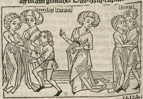 This engraving depicts Scipio Africanus, a Roman general, committing adultery with a young servant girl on the right side of the image. The name Scipio is engraved at the top to identify him. The woman in the centre of the engraving is his wife, Tertia Aemilia. She is depicted looking at her husband and his mistress as they commit adultery. Instead of confronting her husband about the affair, she devises a plan to get rid of the mistress. The left side of the engraving depicts Tertia Aemilia marrying the young servant girl off to a freedman. She does this so that no one finds out about the affair so that it does not ruin her reputation. Her name, written as “Emilia Tertia”, is engraved above her head to identify her. Boccaccio explains that he chose to write on Tertia Aemilia because the way she handled the affair and how she used her cunning was admirable.