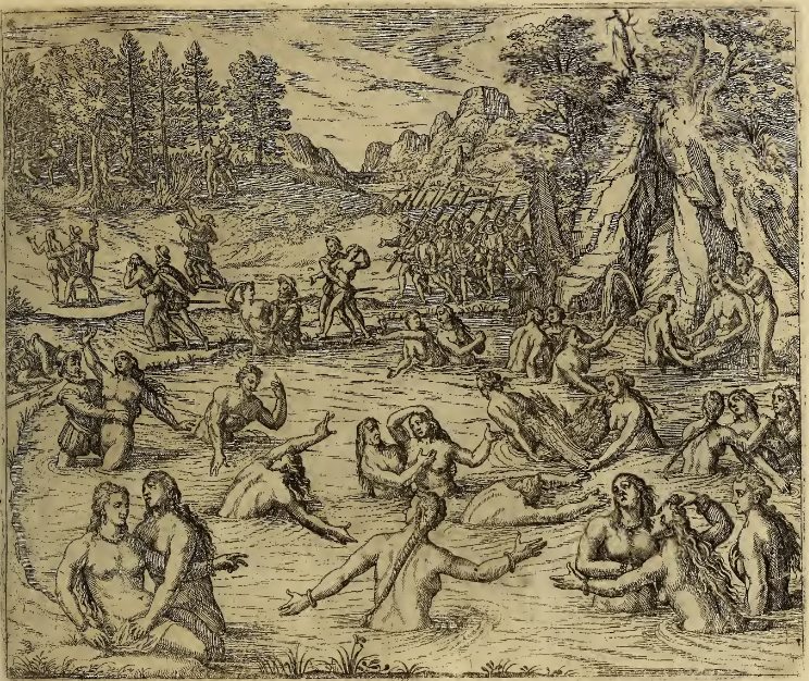 After the Inca Emperor Atahualpa was captured by Francisco Pizarro and his men, Spanish soldiers rampaged through the area around Cajamarca in Peru. Here, a group of soldiers have come across a pond where several Inca women bathe. Some of the Spaniards approach the pond from the far side, and others wade into the water and seize women. Several of the women have been pulled from the water and are dragged by the soldiers towards a stand of trees nearby. Women amongst the trees are pushed to the ground by soldiers, and sexually assaulted.