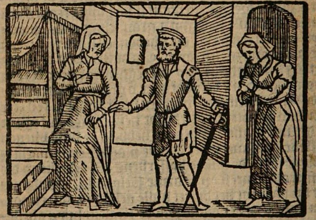 Because this illustration is included at the end of this act, we can infer that it is meant to represent the scene in which Sempronio and Pármeno murder Celestina, after which they jump from the third storey of her house to escape the alguacil’s men. We see a male figure (either Sempronio or Pármeno) reaching out toward Celestina, who appears to be pulling away from him. She is shown wearing a robe and a veil, while he is wearing a hat. In his left hand he is holding a sword, the tip of which is resting on the ground. To the right we see Elicia watching this encounter. She is wearing a robe and a veil, while her face displays an air of sadness.This illustration is somewhat odd for two reasons: there is only one male figure in this illustration, and it does not depict violence like most other illustrations of this scene. I suspect that the use of this illustration (in place of the more relevant 1580 Antwerp edition illustration) may be a consequence of the 1580 woodblock being misplaced or destroyed in the intervening 36 years.The entire image is identical to those found on pages 222 and 246 of the text.