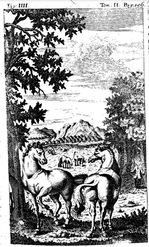 This image shows some of the horses in Houyhnhnms. In the foreground are two horses, with Gulliver in the background on the righthand side. There are several other horses in the background. The landscape is made up of trees and hills. This image is the same as that in the 1727 German von Wiering edition