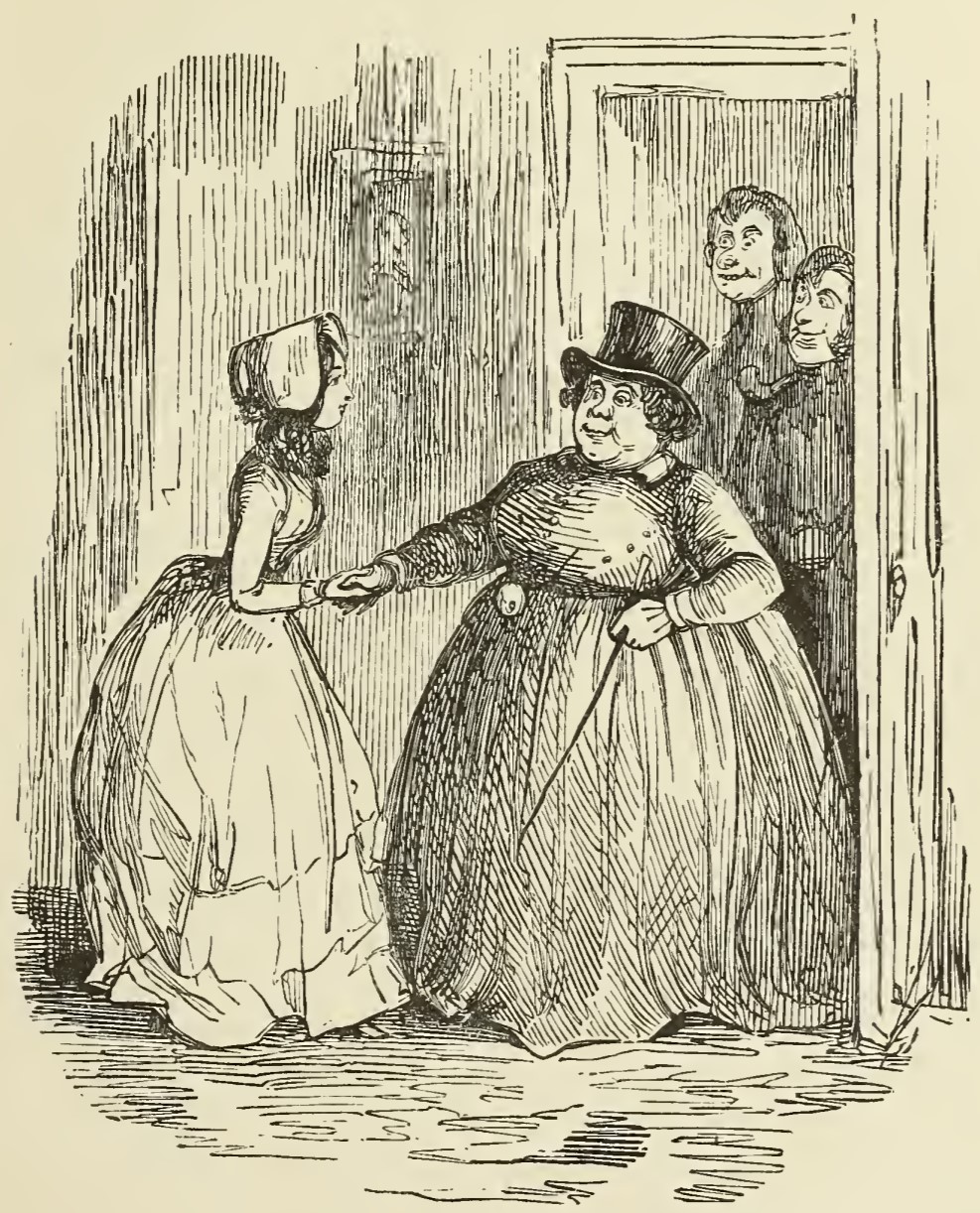 Amelia Osborne, wearing a bonnet, is shaking hands with Peggy O’Dowd, who has just entered the sitting room in a riding-habit, eager to meet the newest addition to the officers’s ladies. Through the doorway behind Mrs. O’Dowd are two officers of the regiment.