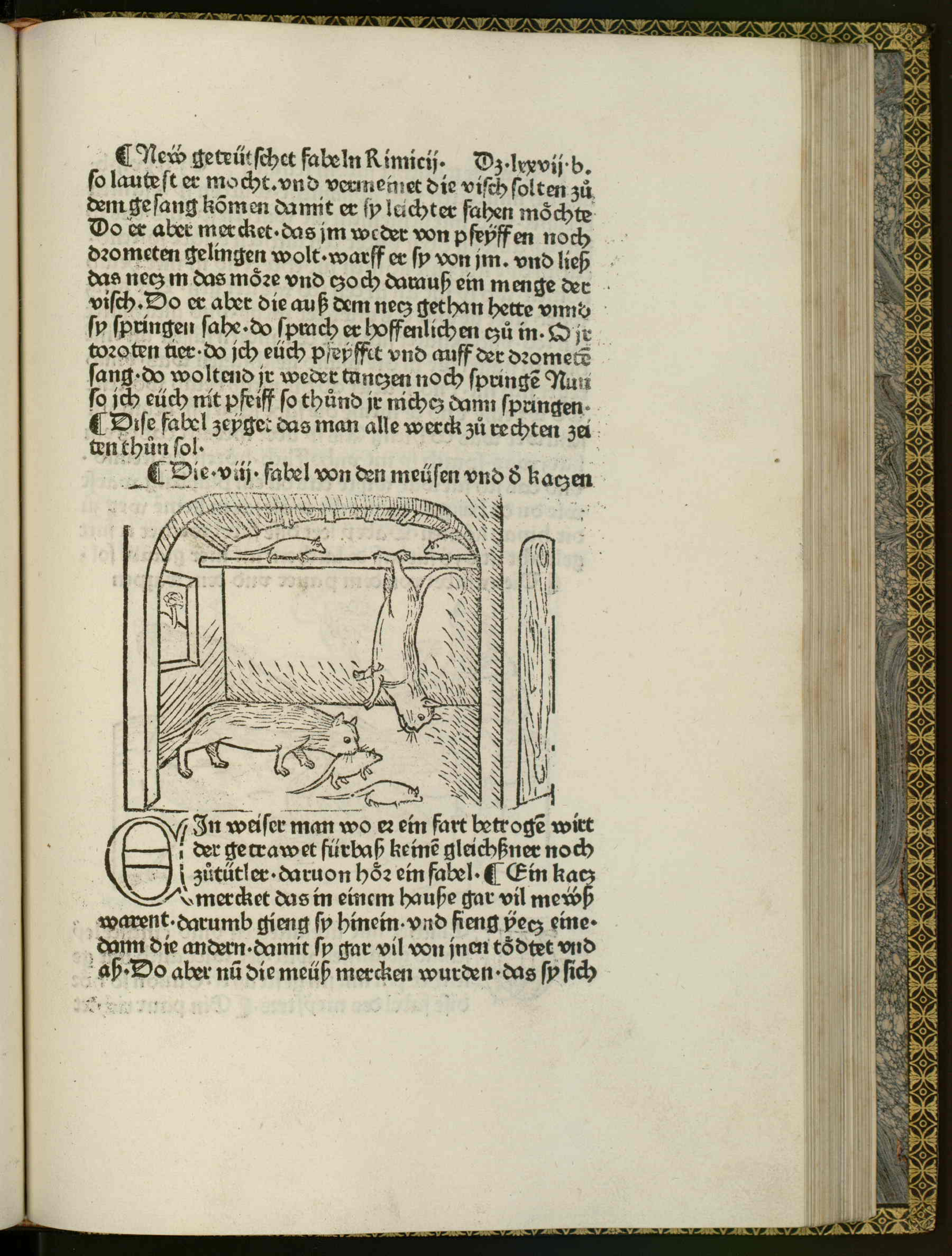 - There are two cats in a room. One cat is hanging from a bar on the ceiling from his feet. Two mice are sitting on that bar. The other cat is on the ground, it has a mouse in its mouth, there is another mouse beside him.