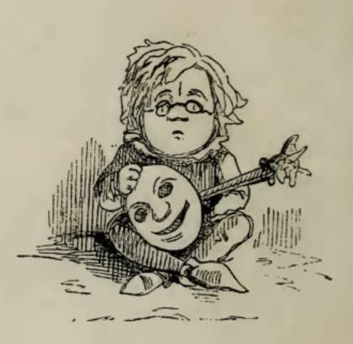 - The narrator, looking destitute, is seated on the ground with a stringed instrument and comedy mask on his lap.
