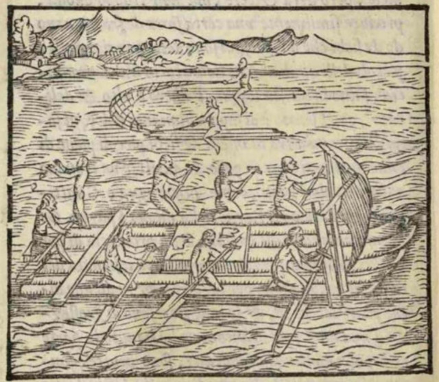 Eight Indigenous people sail near the coast on a large wooden raft. The raft has a single small sail at the fore end and a raised platform in the middle. Around the edges, six of the passengers row with large oars (three on each side). At the rear, one person sits on a raised bench with a smaller oar, and another person throws something into the water. In the background two people sit in the water on long, narrow wooden rafts. They hold a net between them to catch fish.