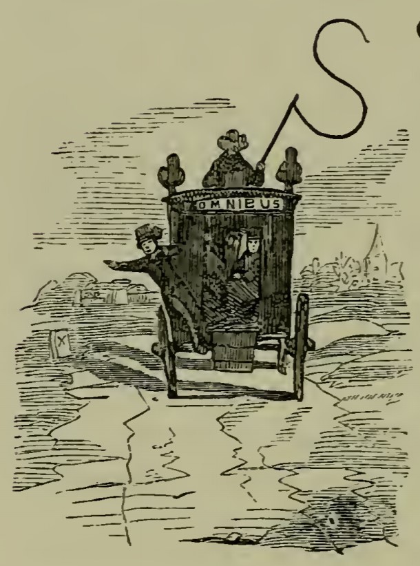 A coach labelled “OMNIBUS” drives along a narrow road away from London, passing a stone marked with an X. One of the passengers is leaning out from the back with his arm outstretched, while two others can be seen seated inside. The coachman is seated above the carriage, holding his crop. Near the tip of the crop, in the sky, is the letter S from “So”.