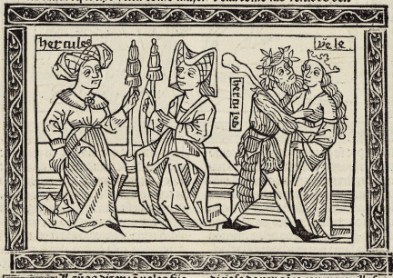 This engraving depicts the marriage between Iole, daughter of King Eurytus of Aetolia, and Hercules. The right side of the engraving illustrates Hercules wrapped around Iole with a look of pure affection on his face. Iole is pictured not reciprocating the embrace. We know that these figures are Iole and Hercules as their names are engraved beside their bodies. Boccaccio explains that Iole is not in love with Hercules because he killed her father after he did not give Hercules permission to marry Iole. In order to seek her revenge on her husband for the murder of her father, Iole allowed Hercules to fall madly in love with her. By doing this, Iole was able to convince Hercules to do whatever she asked. She stripped him of his pride by getting him to dress as a woman and spin wool, which is depicted on the left side of the engraving. As Hercules is unrecognizable in women’s clothing, the creator engraved Hercules’ name above his head to differentiate between him and Iole.