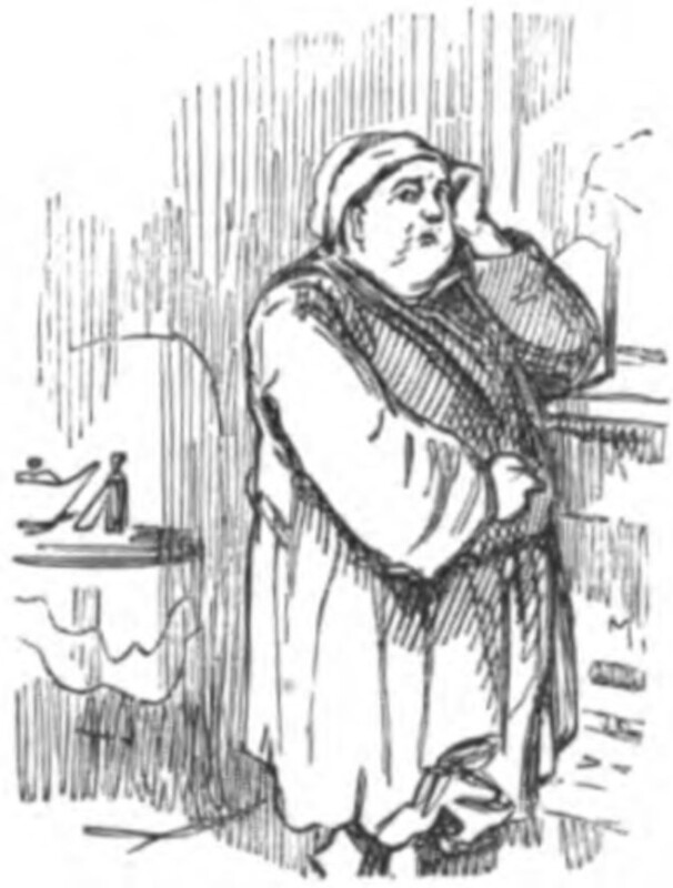 Joseph Sedley, in his dressing gown, stands at his dresser with one hand pressed to his temple, looking pained. In the background to his left is a table with a washbasin and a bottle on it.