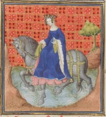 This illumination depicts Cloelia, a young Roman woman, riding a horse through a deep river. Boccaccio explains that Cloelia was given to a foreign king as a hostage, and when she escaped, she took many other hostages with her back to Rome. While escaping, she came across a river that was too treacherous to pass. She found a horse, and despite never having ridden one, she got herself and the other women across safely by means of this horse.