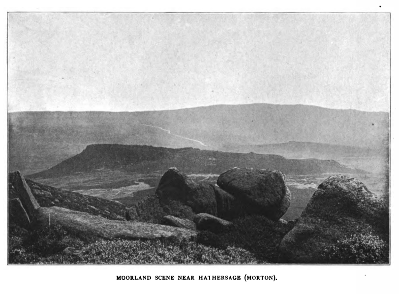 Here we see the moorlands near the village of Hathersage, a village in Derbyshire. After running away from Thornfield after ending her engagement to Mr. Rochester Jane ended up in Morton, which was based on the real village of Hathersage. She arrived at Moor house with Mr. Rivers and his sisters, Diana and Mary. She lived with them for several months and taught at the village school before returning to Mr. Rochester. Before arriving at Moorhouse Jane spent two days and nights walking around the moorlands. The same image appears in the 1899 Harper edition of Jane Eyre.