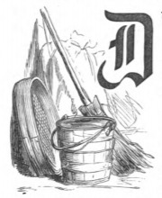 Here we see a broom, bucket, and sieve. These items were things in Gulliver’s hut, which was used as storage before he arrived. This image appears at the beginning of chapter four. The letter “D” appears in the top corner, as the word “during” is the first word of the chapter.