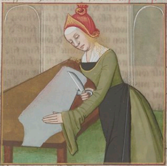 This illumination depicts a Roman woman named Paulina cutting a garment with scissors. Paulina was a chaste and devout woman and is renowned for her naivety by being tricked into losing her virtue. A man named Mundus had tricked Paulina into thinking that he was the Egyptian god Anubis and tricked her into having sexual relations with him. When Paulina realized she was deceived, her husband went to the emperor and had Mundus exiled.