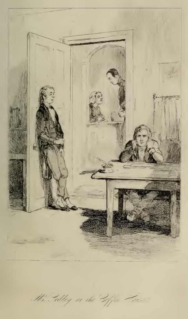 John Sedley is seated at a table at the Tapioca Coffee-house, slouching over with his elbows resting on the table and his scowling face between his fists. On the table in front of him are several pieces of paper and an inkwell with a quill. The door to the room is held open by a bored-looking man who leans against it. Through the doorway, William Dobbin can be seen talking to the woman at the desk. Below the illustration is printed in cursive its title, “Mr. Sedley at the Coffee-House.