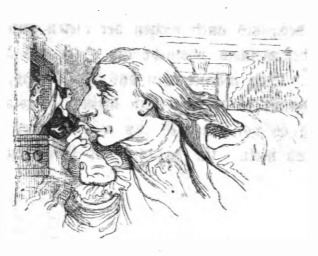 In this image Gulliver kisses the hand of the Empress, who greets him while standing on the balcony of her apartments. The Empress wears a dark dress and a tall headpiece with a veil down her back, attached to the headpiece. This image comes after Gulliver climbed over the wall of the imperial palace and was able to look around. One of the Empress’ attendants stands behind her. The same image appears in the 1843 Krabbe edition.