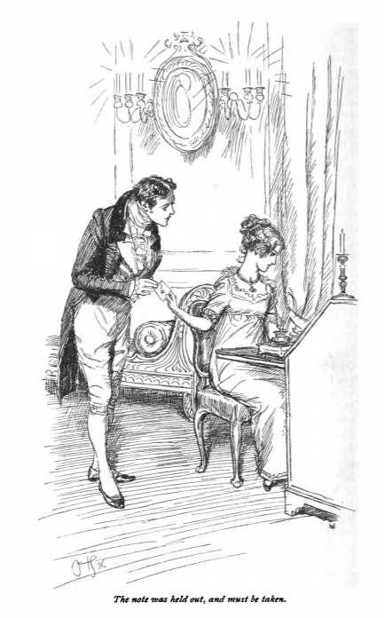 Here we see Fanny writing a note to Miss Crawford, hand handing it to Mr. Crawford. Miss Crawford wrote a note to Fanny expressing her excitement at Mr. Crawford’s proposal, assuming she would accept. Mr. Crawford wanted Fanny to respond, so she quickly wrote to Miss Crawford, saying that she had not accepted his proposal, and handed the note to Mr. Crawford so he could deliver the note. This scene occurs in chapter 31. The characters are shown in the traditional regency style. Fanny wears a regency style dress with an empire waist. Mr. Crawford wears a tailcoat and tailcoat with breeches. The regency period dated to the early nineteenth century (1811-1820) when George, Prince of Wales, later George IV (r. 1820-1830), reigned as regent for his mentally ill father, King George III (r. 1760-1820). The regency period is associated with the rise of neoclassicism in art and fashion.